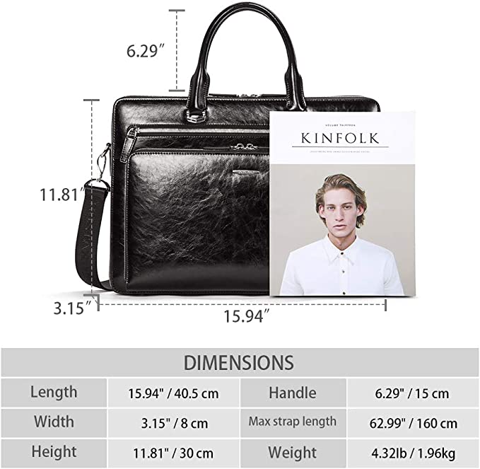 - High Quality -- The leather briefcase is made of the finest durable, top-grain cowhide oil wax leather. Durable fabric lining with sturdy silver-color Hardware. The zippers are long-lasting and anti-breaking. It has a removable, adjustable shoulder strap with a padded cushion.