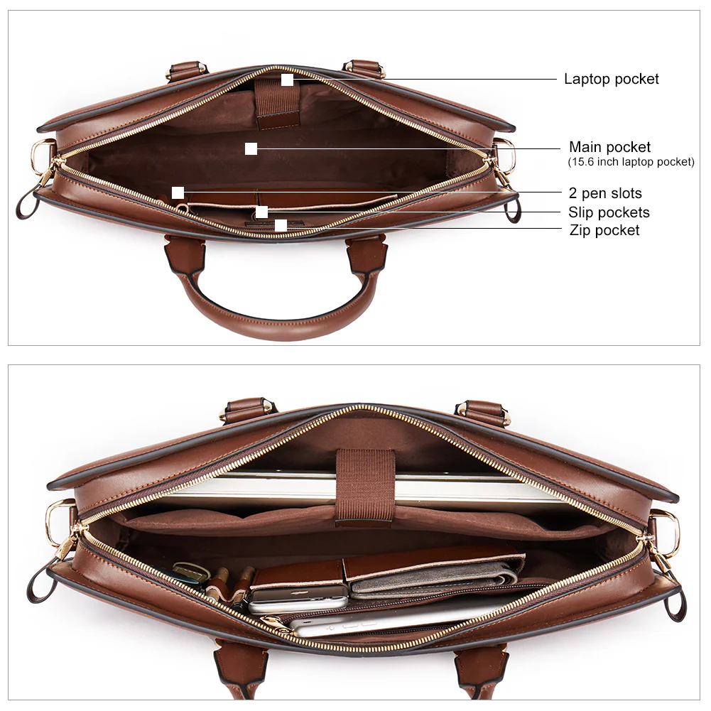 - STRUCTURE: Interior with 1 big inner compartment + 1 laptop pocket + 1 zipper pocket + 2 slip pockets + 2 pen slots . The briefcase easily hold your 15.6 inch laptop, iPad, iPhone, A4 File, And other business things.