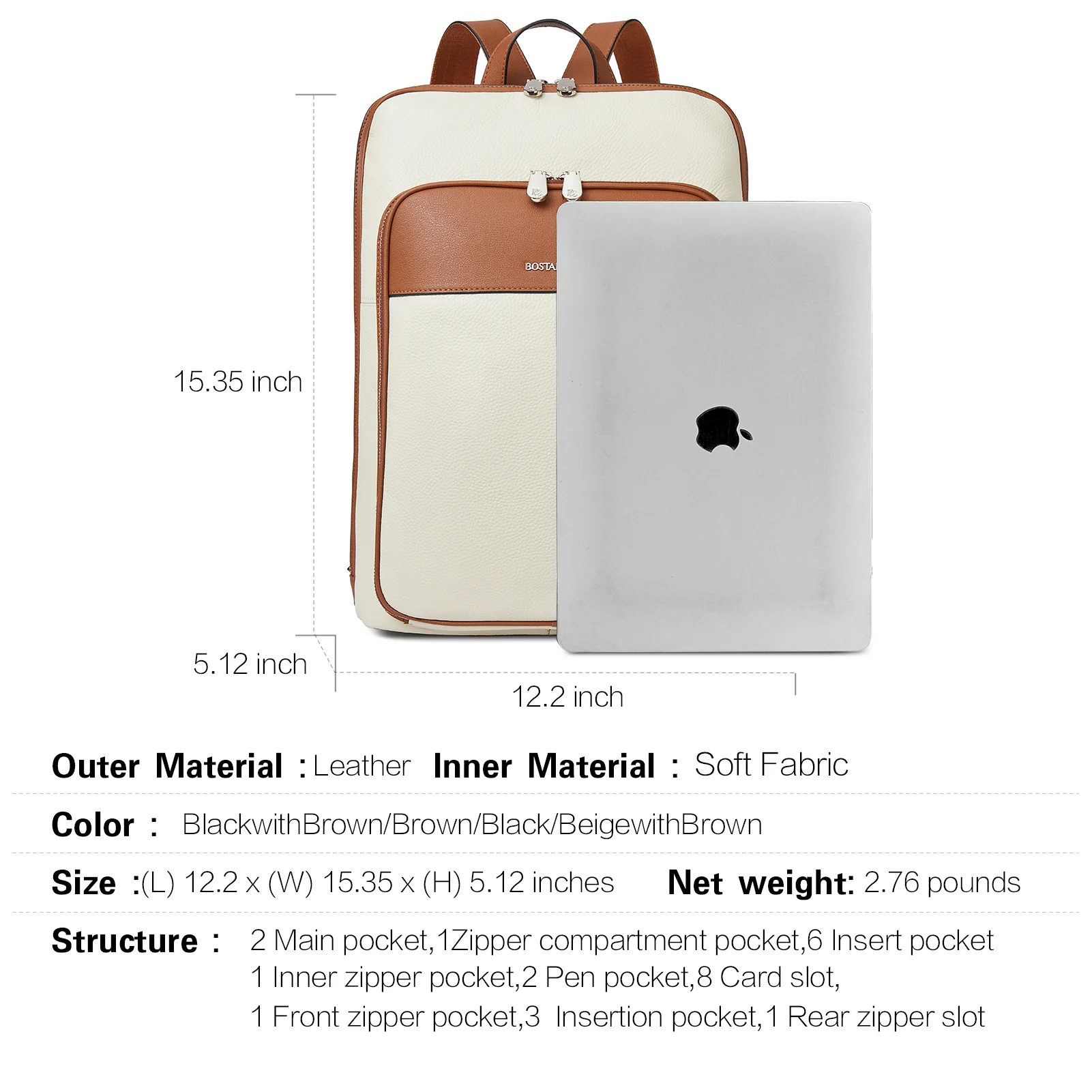 - Structure -- 1 main zipper pockets with 1 laptop pocket( with padded compartment &velcro closure effectively protect your notebook from damage), 2 inner zipper pockets, 4 slip pockets, 2 pen slots, 1 front zipper pocket with 8 card slots,1 conceal zipper pocket. There are multiple pockets inside to keep your belongings organized and easier to find.