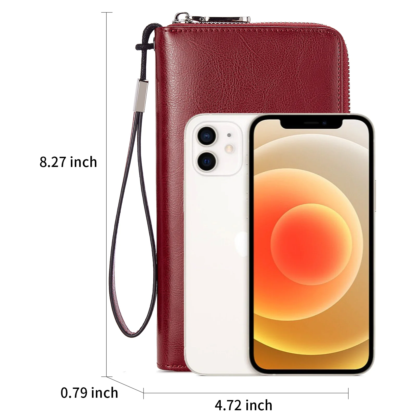 - Measurement -- (L)8.2 x (W)4.7 x (H)0.79 inches / (L)21x (W)12 x (H)2 cm. Weight is 0.55 pounds / 0.25kg. The length of wristlet is 7.48 inches / 19cm. The interior pocket is roomy and can hold up your iPhone Plus!