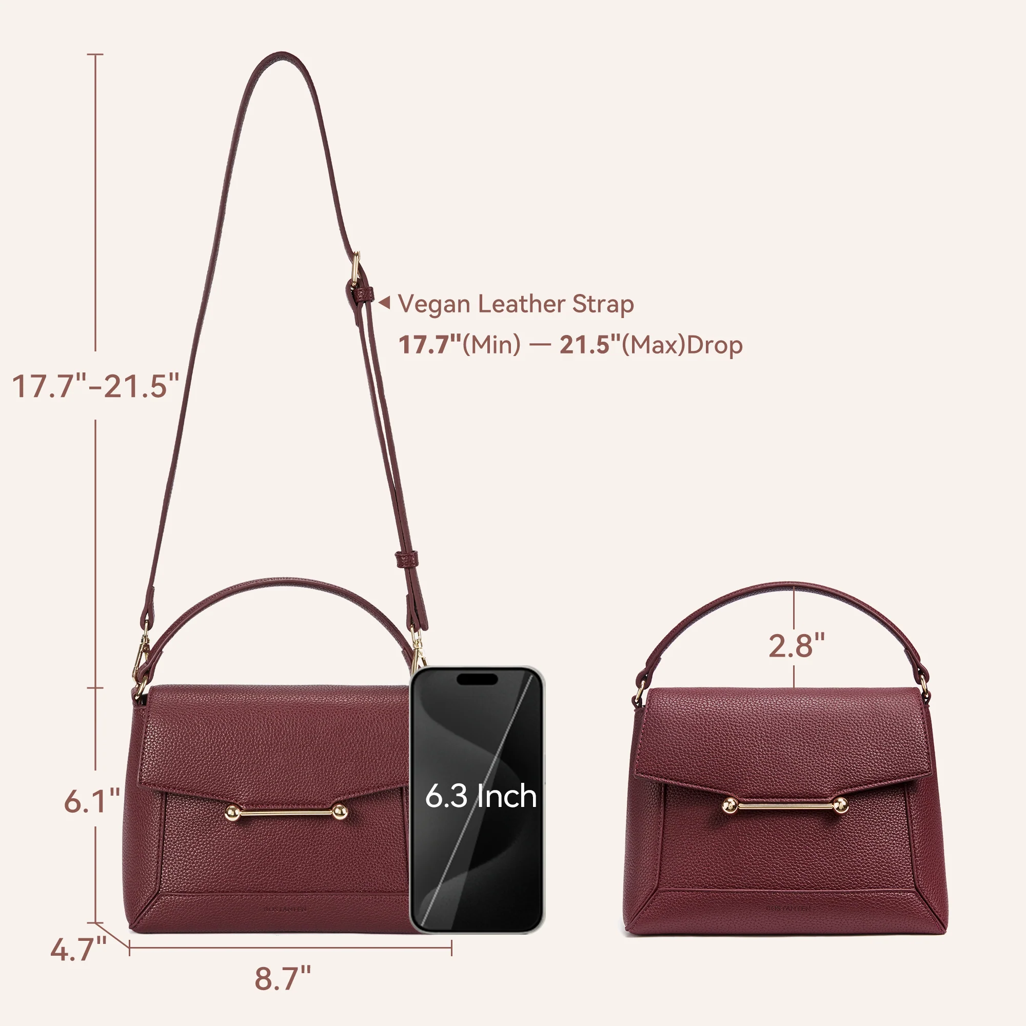This small crossbody bag features a secure magnetic flap closure to keep your essentials safe and accessible. Crafted from high-quality vegan leather with elegant metal accents, it retains its shape while offering a refined look. The compact size includes a main compartment with an inner pocket—perfect for phone, wallet, and daily items. With a top handle and adjustable strap, it can be worn as a crossbody, shoulder bag, or handbag. A stylish and thoughtful gift for any occasion.