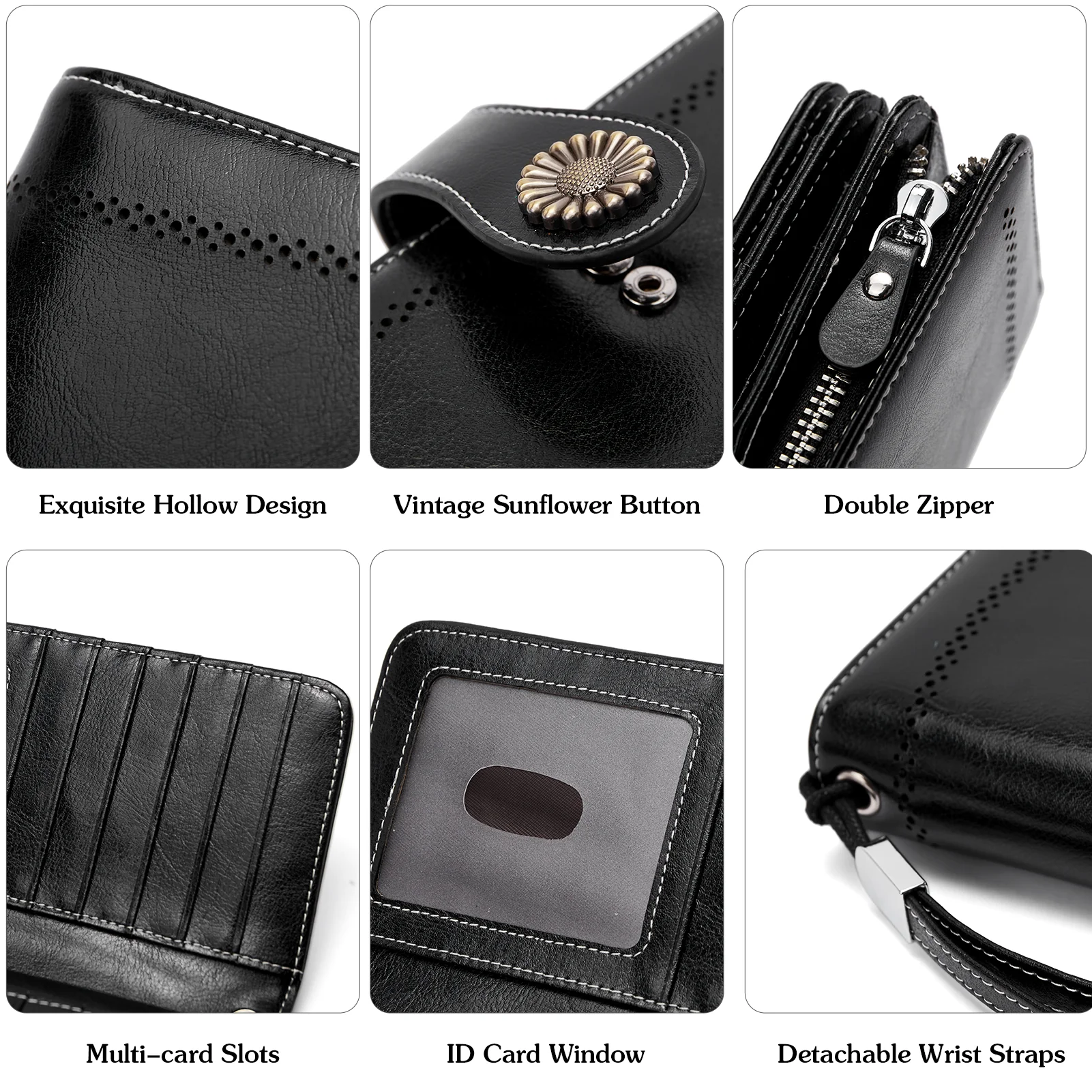 - Unique Features -- Made of high quality cowhide genuine wax oil leather. Durable zipper and snap for long time use. Each leather purse comes with a wrist strap, biofold wallet is convenient to use. Sun flower buckle and hollow design are in vintage style and more fashion.